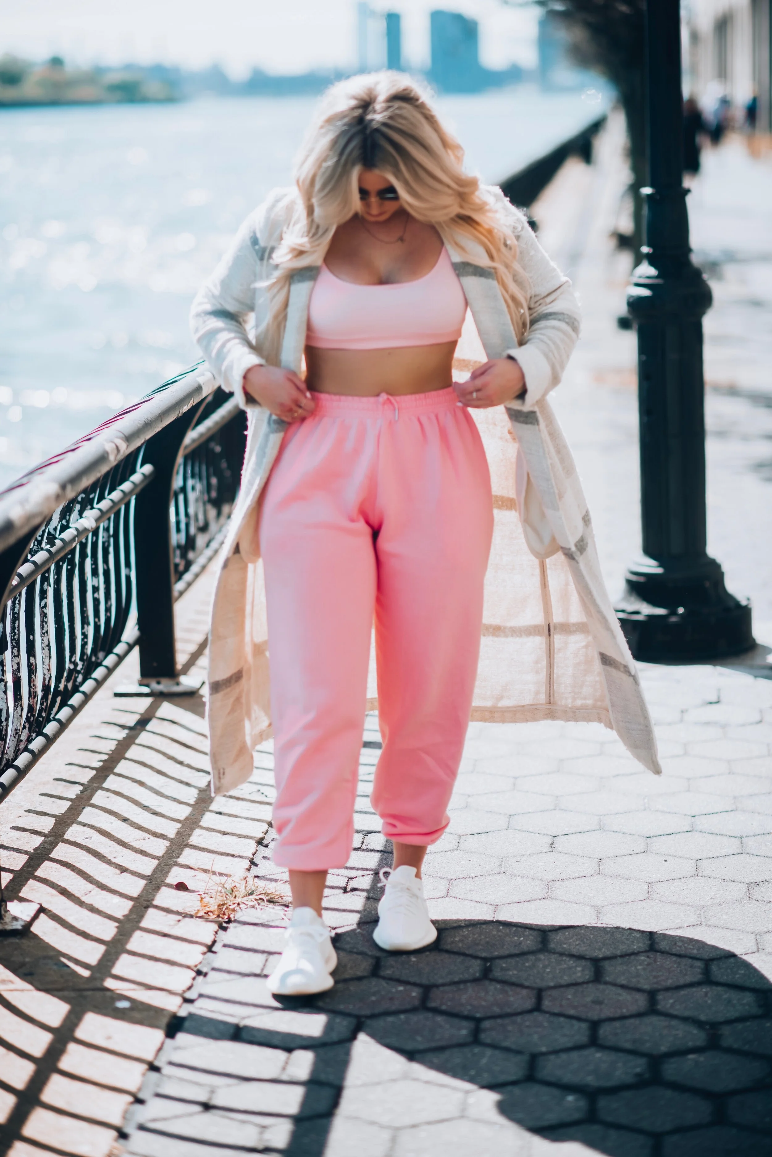 I paired the look with a straight, over-sized duster for dimension. I also made sure I chose a coat with a pattern since the set is a solid pink. Hint: The trick to this look is buying ONE SIZE LARGER in the bottoms and a true-to-size top. ;-) I got this two-piece outfit from SLA The Label online but there sooo many different retailers selling this look right now! I’ll link below. :)